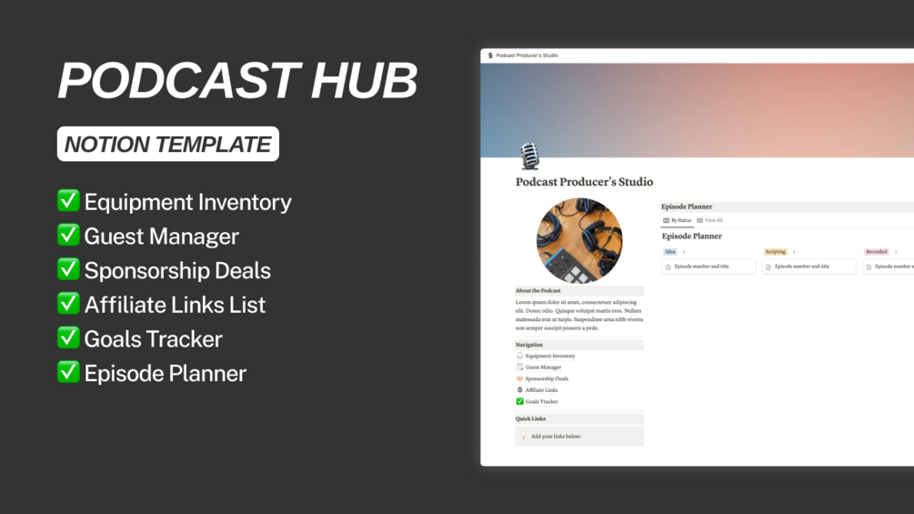 Introducing the Podcast Producer Notion Template – your all-in-one solution for organizing every aspect of your podcast journey. Whether you're just starting out or managing a growing show, this template provides everything you need to stay on top of your game.